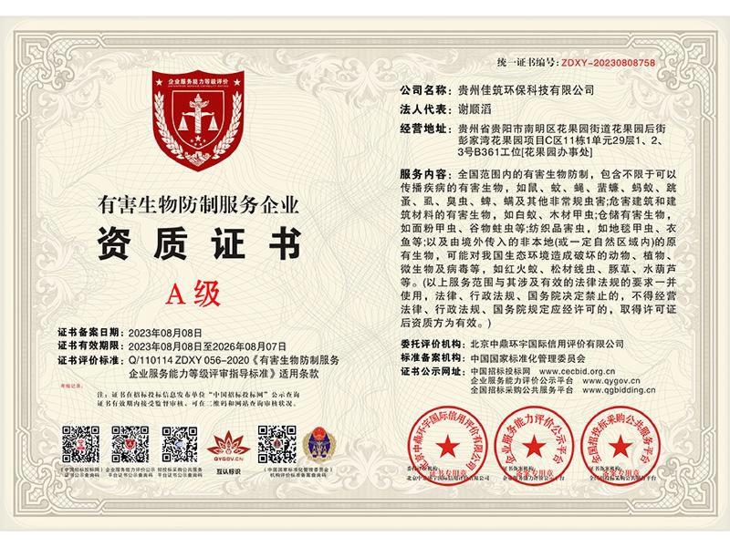贵州佳筑环保科技有限公司是一家专注于环保消杀技术服务的创新型企业,致力于为客户提供高效、安全、环保的有害生物防治、消毒杀菌及林业绿化养护服务。公司属“A”级资质公司,是《中国有害生物防制协会》的会员单位。持有《有害生物防制服务企业A级资质证书》、《公共环境消毒杀菌服务企业一级资质证书》、《病媒生物预防控制机构资质证林业有害生物防治A级资质证书》、《病媒生物预防控制机构资质证白蚁防治防治A级资质证书》,并聘用有害生物防制中心“龚成举教授”为我司技术指导,获得多年《优秀服务公司》的荣誉称号,公司位于贵州省贵阳市南明区花果园街道花果园后街彭家湾花果园项目C区11栋1单元29层1号,是贵州省有害生物防治及病媒生物防治领域先行者之一,是集有害生物防治服务、各类生活(农业)虫害防治服务、鼠患防治服务、白蚁防治白蚁巢穴检测灭治及预防服务、驱蛇服务,林业绿化修剪服务、林业绿化虫害防治服务为一体的综合性环保消杀服务公司。